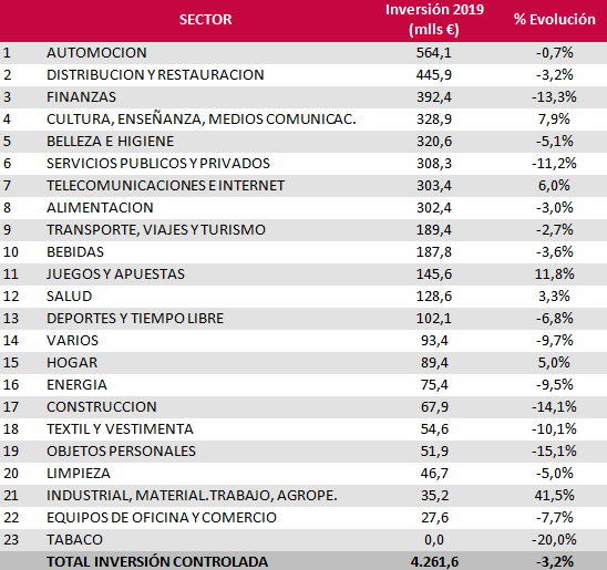 Lideran la tabla automoción (564,1 millones), distribución y restauración (445,9 millones) y finanzas (392,4 millones). La suma de los diez primeros sectores supone el 78,5% del total de la inversión publicitaria.