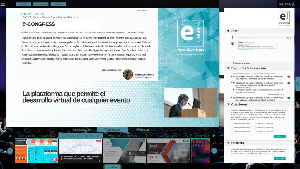 El usuario dispone de actividades de networking y establece conexiones reales y enriquecedoras entre participantes. Permite que ponentes del más alto nivel puedan compartir sus conocimientos desde cualquier lugar del mundo, y así den respuesta a las cuestiones planteadas por los asistentes en tiempo real.