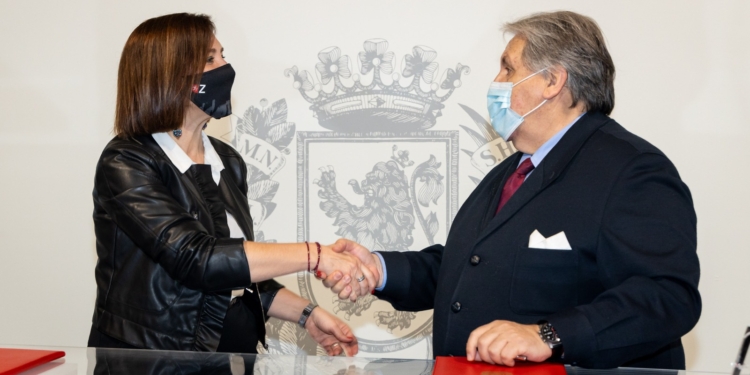 La vicealcaldesa y consejera de Cultura y Proyección Exterior, Sara Fernández, y el presidente de Feria de Zaragoza, Manuel Teruel, han suscrito este martes este convenio en un acto en el salón de recepciones del Ayuntamiento.