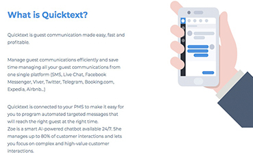 The Colossal Factory ha creado un software de interfaz y mensajería instantánea denominado Quicktext, que permite a los hoteles comunicarse directamente con sus clientes a través de Zoé, una Inteligencia Artificial multilingüe cuya misión consiste en asistir al internauta en la preparación de su estancia.