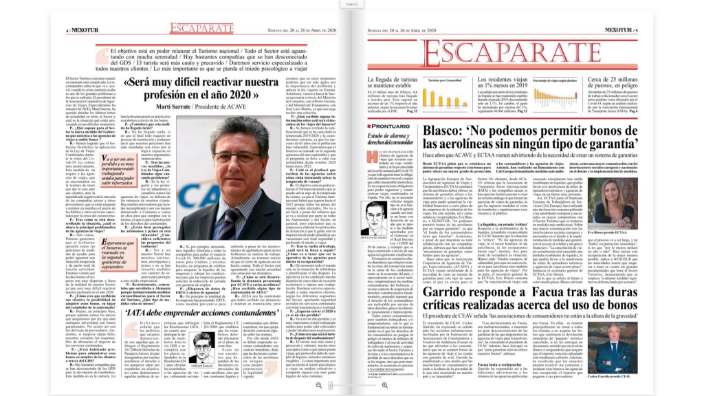 La opinión editorial ofrece un análisis de las noticias que dominan la actualidad sectorial: el bono de agencias, la fusión de la década, la garantía aérea y el "sello" anti Covid-19 , con Miguel Mirones como Protagonistas de la Semana. La Entrevista está dedicada la Asociación Corporativa de Agencias de Viajes Especializados ha tratado (ACAVE), Martí Sarrete, que analiza la situación actual del Sector de agencias de viajes ante la crisis por el coronavirus. También se incluye la Tribuna de Opinión a cargo del director ejecutivo de SpainDMCs, Luis Díaz; y una Columna de Opinión del director de NEXOTUR, Eugenio de Quesada, a modo de obituario de Emiliano González.
