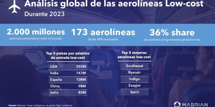 De este análisis se extrae que los países con más presencia de aerolíneas low-cost son Estados Unidos con más de 395 millones de asientos, la India con 147 millones, España con 108 millones, China con 98 millones e Italia con 85 millones de asientos low-cost.