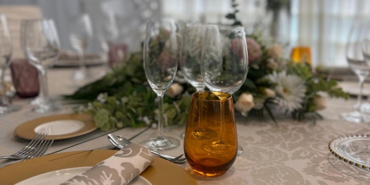 En la primera planta del hotel se encuentra este nuevo showroom, que abarca aproximadamente 43 m² y ha sido concebido como un espacio expositivo. Diversos montajes de mesas, que incluyen mantelerías, cristalerías, cuberterías y elementos decorativos, permiten al cliente visualizar opciones específicas para su celebración.