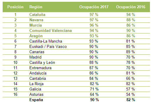 Por regiones, Cataluña y Navarra encabezan el ranking de ocupación para la noche del 31 de diciembre, con un 97%, seguidas de Murcia (96%), Comunidad Valenciana (94%) y Aragón y Castilla-La Mancha (93%). País Vasco, Canarias y Madrid registran un 90% de ocupación en sus alojamientos rurales. Por otro lado, Asturias y Galicia vuelven a ser las regiones con menor ocupación para Nochevieja un año más, con un 64% y 71% de ocupación respectivamente.