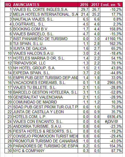 De las grandes plataformas online de distribución turística, Logitravel ocupa la posición más destacada (cuarta plaza del listado) con 4,6 millones, un 2,3% más que el año anterior. Le sigue Booking, que escala hasta la quinta posición a raíz del aumento del 158,8% de su inversión en publicidad, pasando de los 1,7 millones de 2016 a 4,4 millones en 2017.